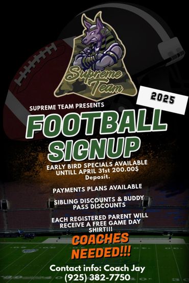 We are a non-profit youth football team based out of Antioch California. Our goal is to provide a safe and fun environment for our youth as they grow together and learn the game of football at the same time. We offer tackle football in the fall and 7v7/5v5 during the winter until the spring. We have some of the best mentors and coaches in the area as we stride to become better as a group.